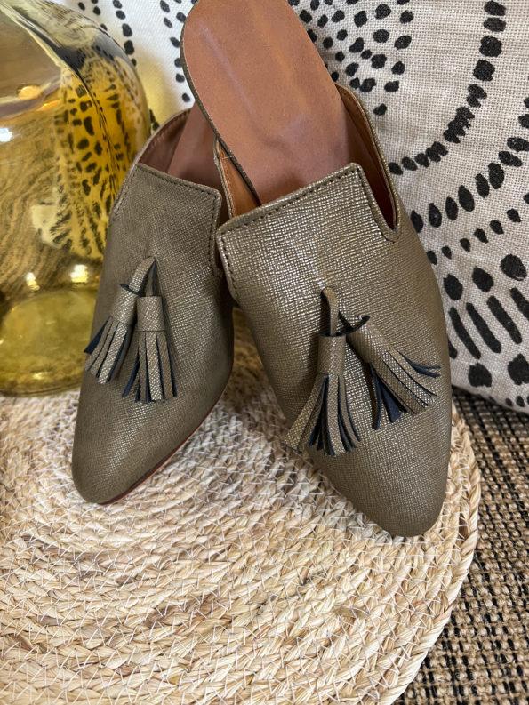 chaussure femme pointue tout cuir cousue pompon couleur bronze